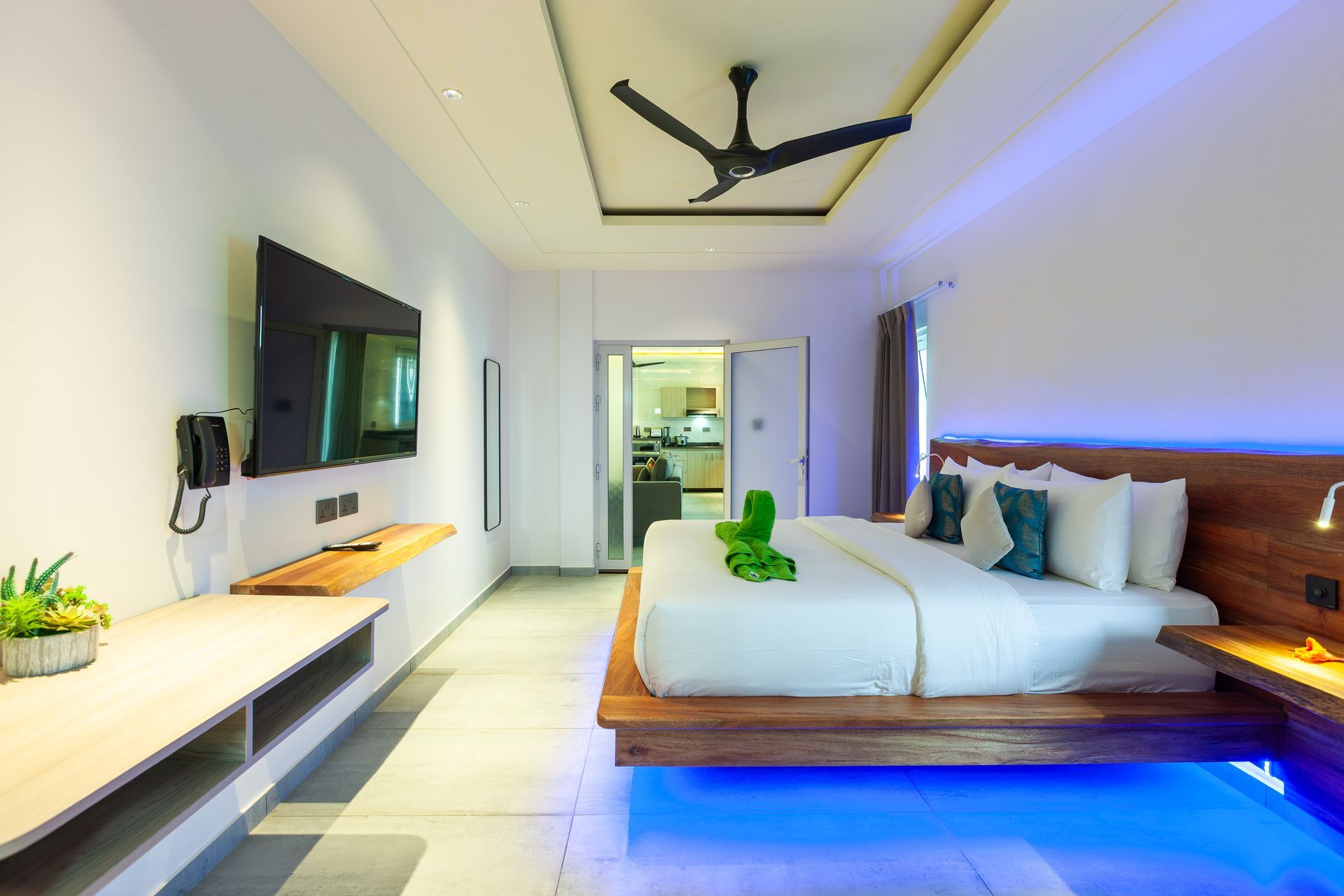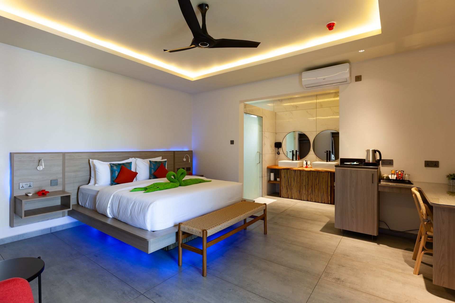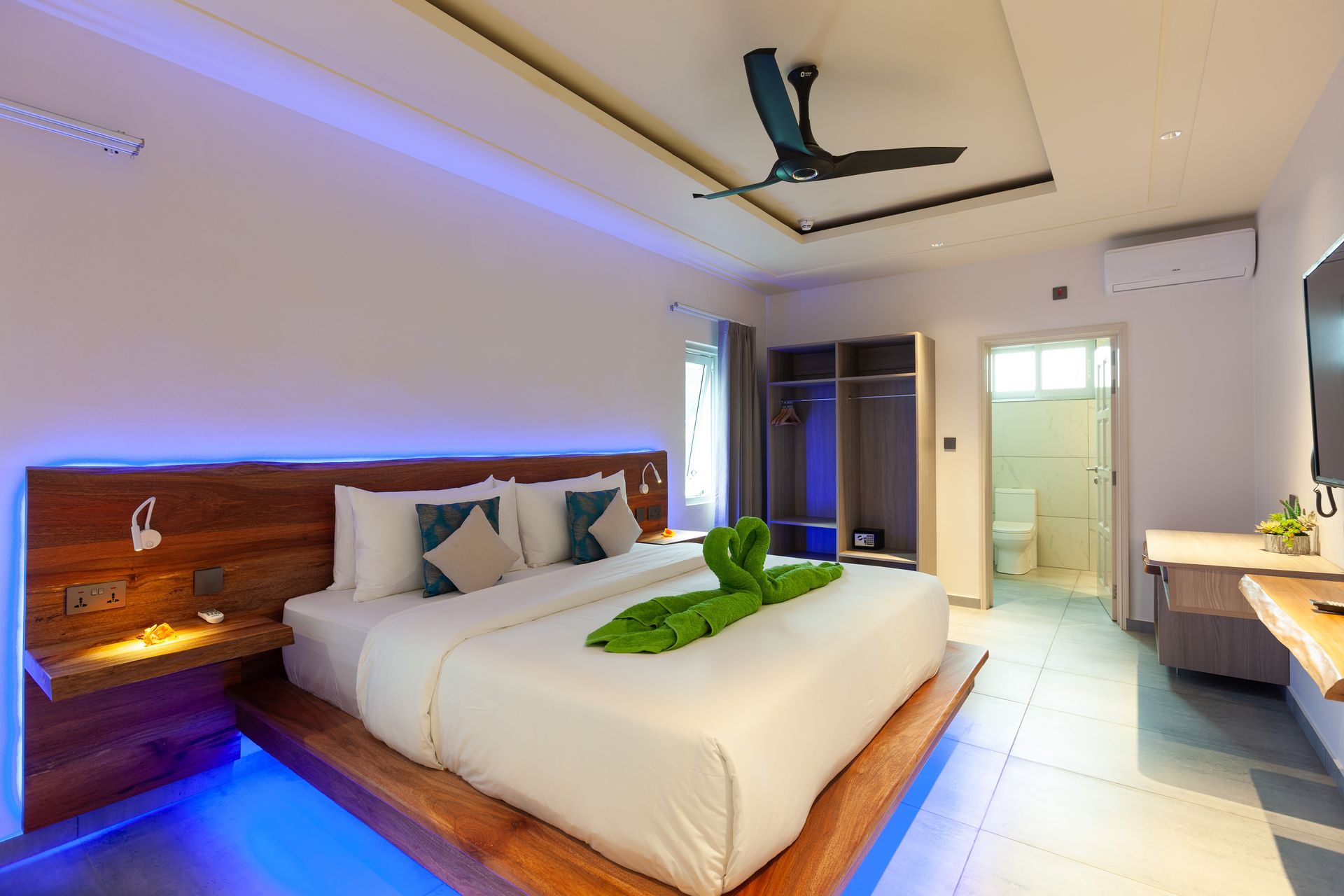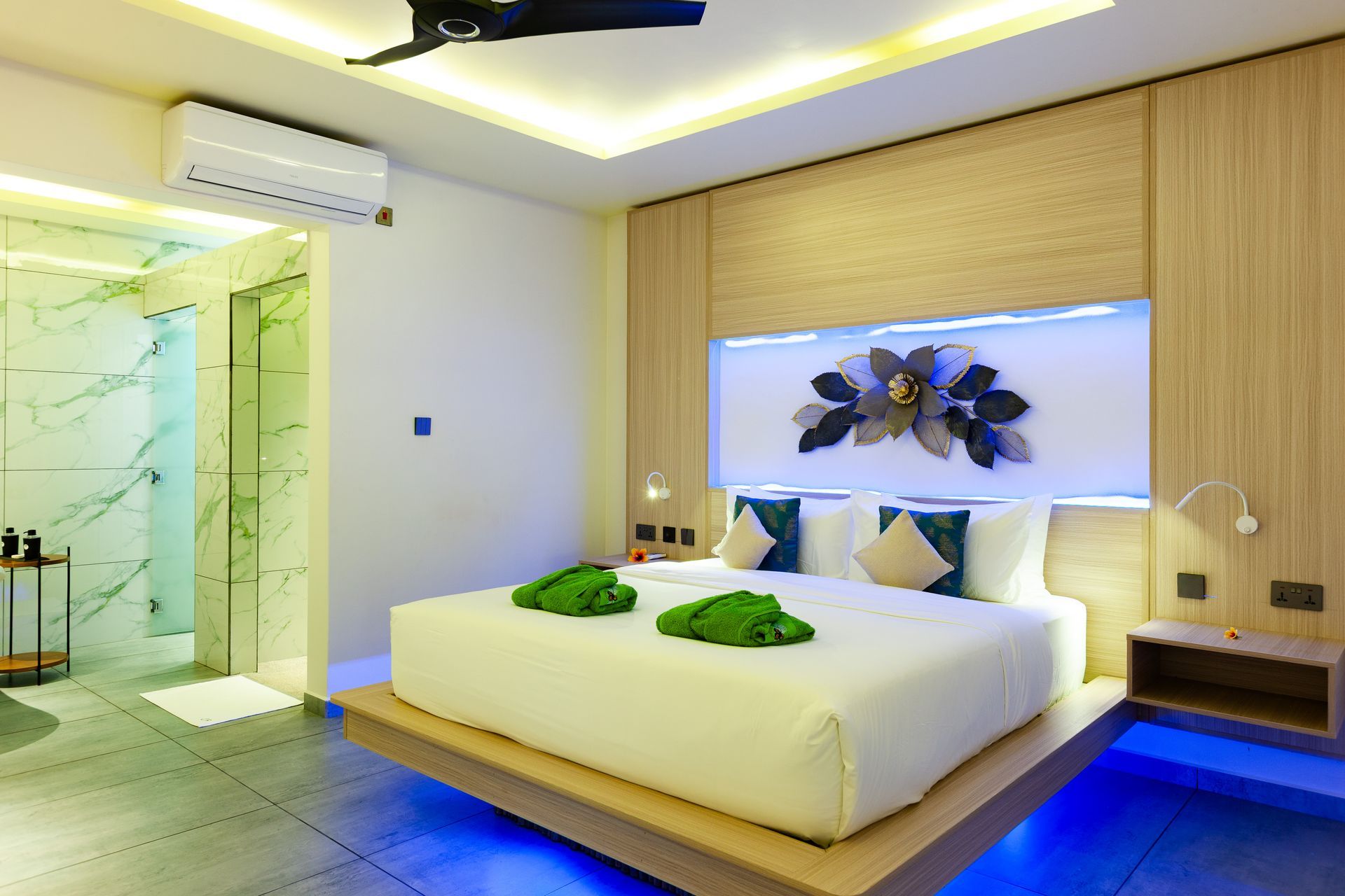 Green and white towel art on a bed: a swan, a leaf, and a head covering, plus a disposable cup.