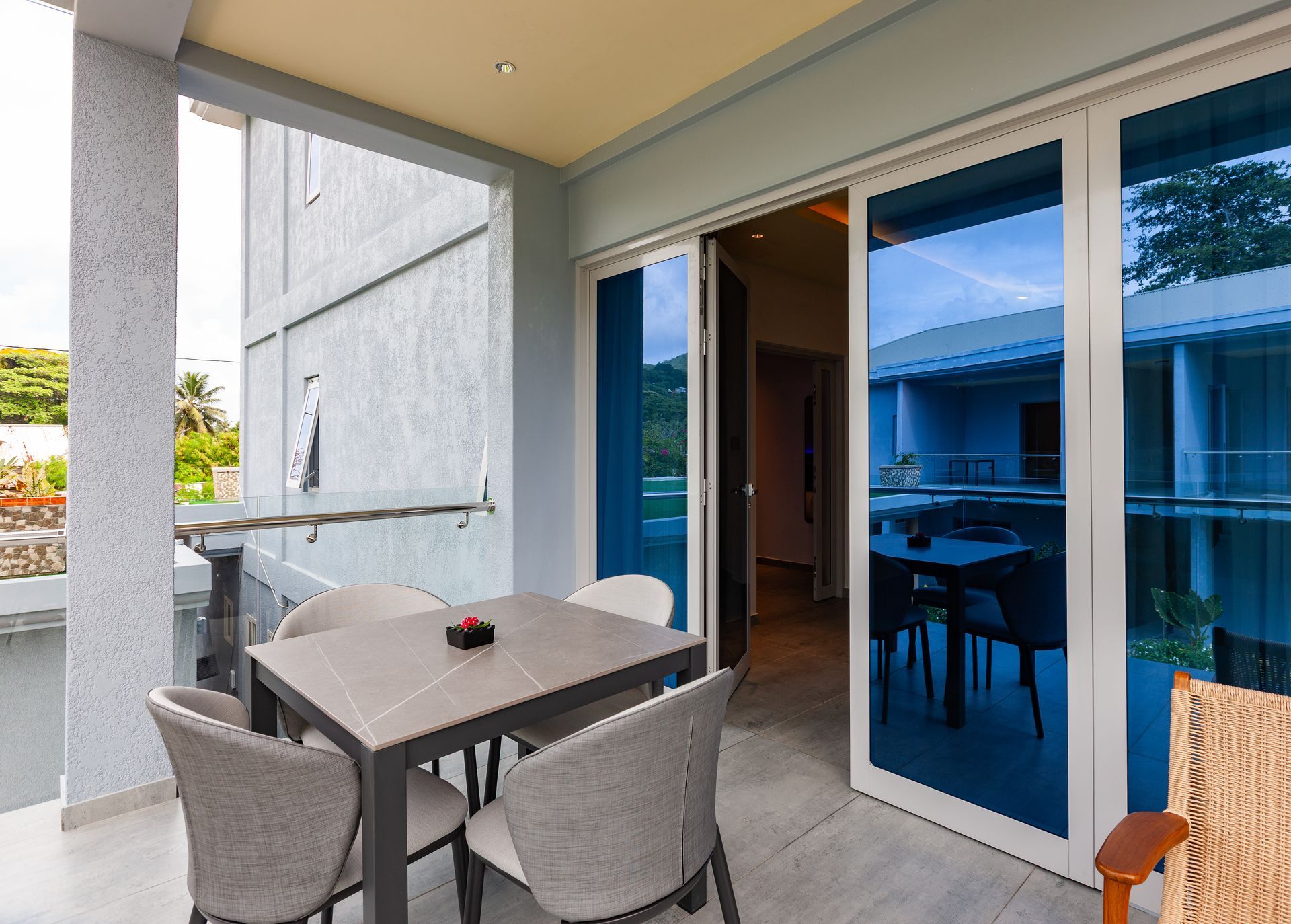 Outdoor restaurant dining tables and buffet setup with neutral color scheme.
